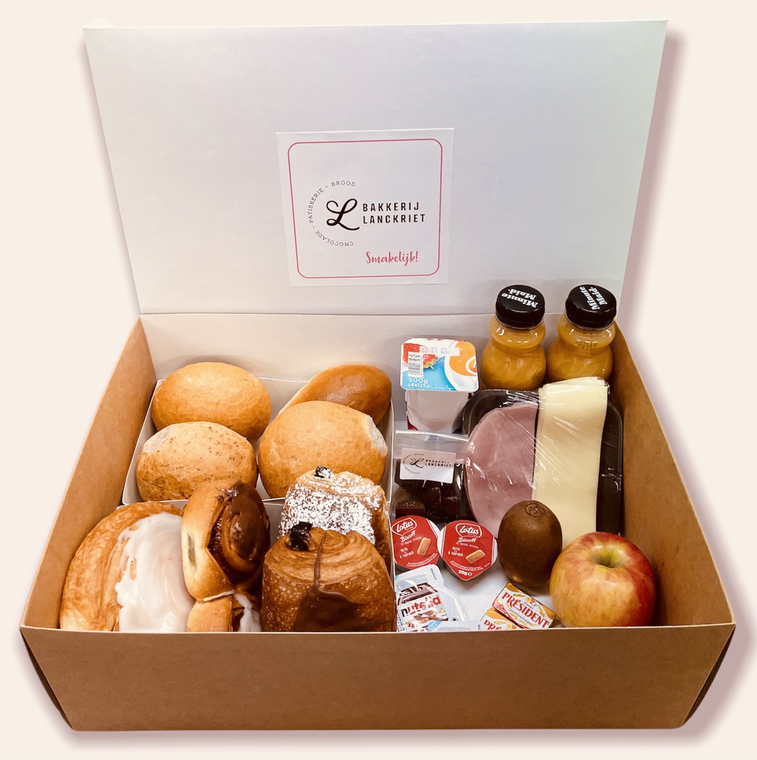 Image Ontdek onze ontbijtboxen voor twee personen:4 pistolets4 koffiekoekenKaas & hespStuk fruitYoghurtConfituur, choco, boterFruitsapChocoladeverrassing Twee personen zonder cava: €25,00Twee personen met cava: €30,00
